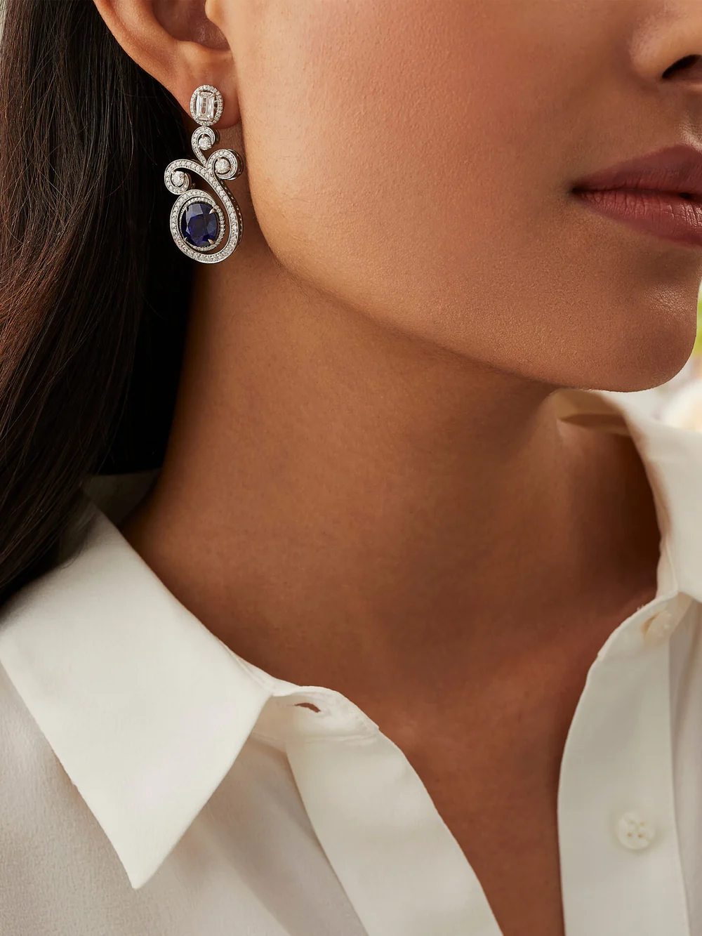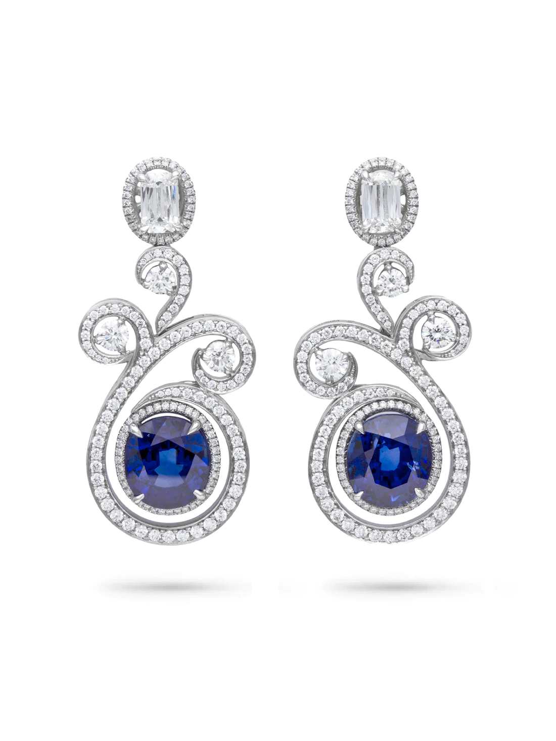 An intricate design featuring over 12 carat of blue sapphires, within a handcrafted platinum setting. Swirls of delicate oval and Ashoka diamonds envelop these vivid and unique stones, as part of the Vintage Lace collection. Ashoka cut diamonds certificated, one at GVS1 0.64 carats and the other at GVS2 0.61 carats. The sapphires total 12.22 carats and additional diamonds total 2.45 carats.